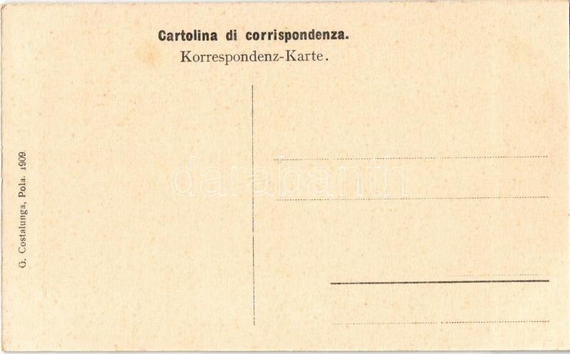 Description: K.u.K. Kriegsmarine, Aus dem Matrosenleben / Vita militare / Austro-Hungarian Navy life, mariners on mainland with cannon shell. G. Costalunga Pola 1909.