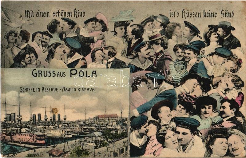 Description: Pola, Pula; K.u.K. Kriegsmarine Schiffe in Reserve. Mit einem schönen Kind ist's Küssen keine Sünd. G. Costalunga / Austro-Hungarian Navy montage with kissing mariners / Osztrák-magyar haditengerészet montázsa csókolózó matrózokkal