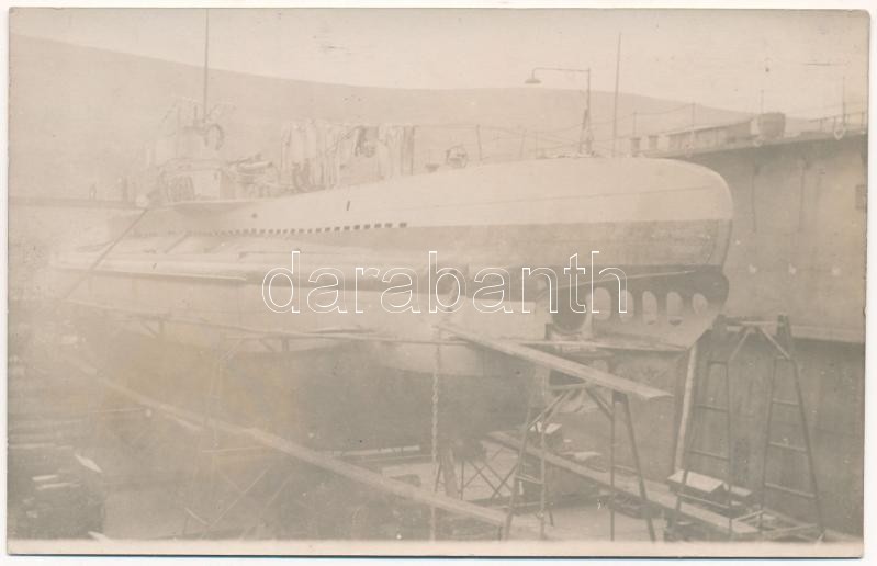 Description: SM U-23 (U-XXIII) a Császári és Királyi Haditengerészet Havmanden-osztályú (U-20 osztályú) tengeralattjárója a szárazdokkban, matrózok száradó ruhái / K.u.K. Kriegsmarine Unterseeboot SM U-23 (U-XXIII) der U-Boot-Klasse 20 / Austro-Hungarian SM U-23 (U-XXIII) U-20-class submarine at the dry dock with mariners' drying clothes. photo