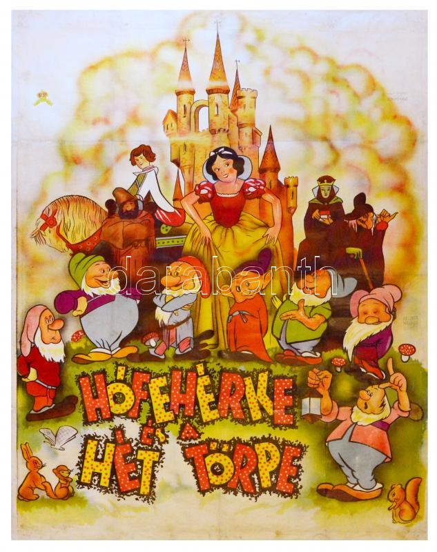 cca 1938 Hófehérke és a hét törpe, Bp., Kellner Márkus-ny., jelzett a nyomaton: Walt Disney után Enyingi, forgalomba hozza: Mozgóképüzemi R.T., "Royal", plakát. Színes litográfia, papír, restaurált, hajtásnyomokkal, 123x95 cm. Ritka! / cca 1938 Snow White and the Seven Dwarfs hungarian poster, restored, 123x95 cm. Rare!