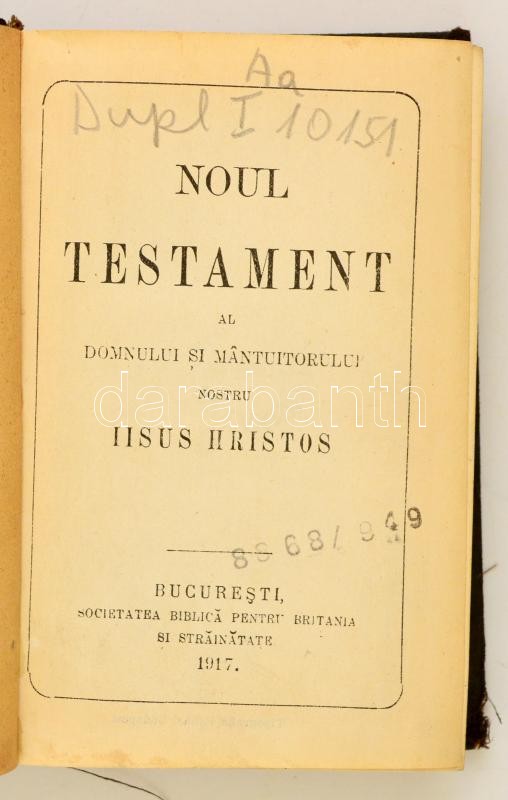 Description: 2 db Újszövetség, orosz illetve román nyelven: Noviy zavit Gospoda nashego Iisusa Hrista. Berlin, 1916, Izdaniye Britanskago i Inostrannago Bibleysago Obshchestva.; Noul testament al Domnului şi Mântuitorului nostru Iisus Hristos. Bucureşti, 1917, Societatea biblică pentru Britania şi străinătate. Kopott, kicsit sérült vászonkötésben.