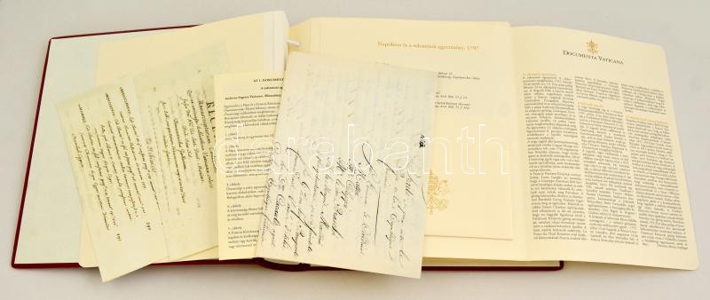 Description: Documenta Vaticana sorozat, 8 db kiadói aranyozott műbőr-mappában, kiadói tokban. Válogatott dokumentumok a Vatikán levéltárából. Reprodukciókkal, melléklettekkel, a dokumentumok átirataival, fordításaival. Színes illusztrációkkal. Bp., Archív Kiadó. Az első kötetben tulajdonosi oklevéllel. 243. számú sorszámozott példány. A teljes gyűjteményt igazoló kiadói levéllel. Jó állapotban.