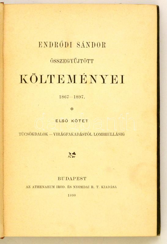 Endrődi Sándor összegyűjtött költeményei. 1-4. kötet. Bp., 1898, Athen... https://www.darabanth.com/en/330-Online-auction/330.0/Books/Books-Religion~1500016/Endrodi-Sandor-osszegyujtott-koltemenyei-1-4-kotet-Bp-1898-Athenaeum-1-tcimkepplusV~II1829296