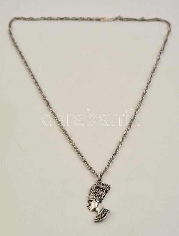 Ezüst(Ag) Nofertiti függő, csavart láncon, 3,8×2 cm, h: 51 cm, nettó: 12,2 g