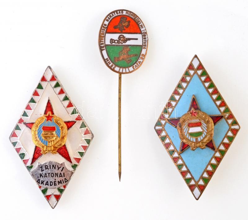1989. "Testvériség Barátság Honvédelmi Többtusa - MHSZ - Tata '89" zománcozott kitűző + DN "Zrínyi Katonai Akadémia" (2xklf ) zománcozott sapkajelvény T:2
