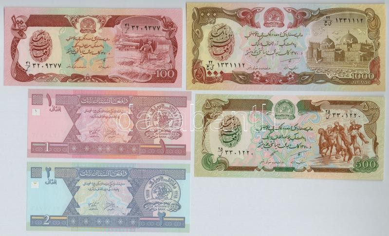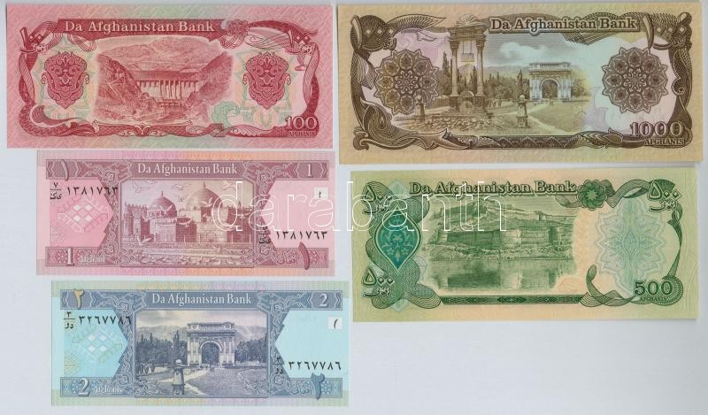 Afghanistan 1979. 100 Afghanis + 500 Afghanis + 1000 Afghanis + 2002. 1 Afghani + 2 Afghanis C:UNC