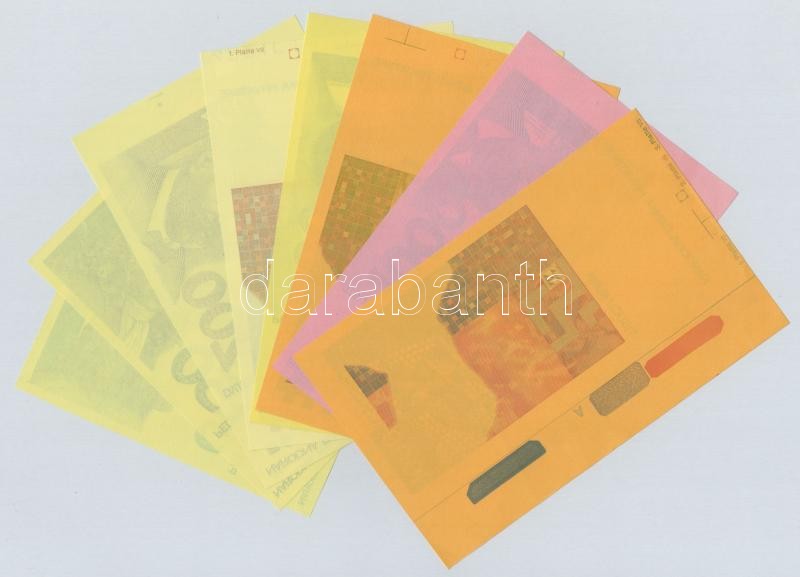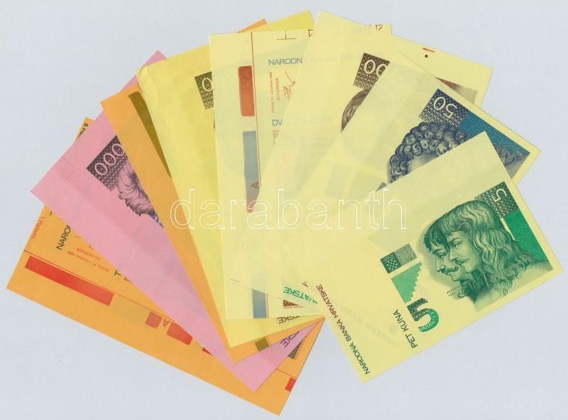 Horvátország 1993 (1994). 5K előlapi színpróba + 50K előlapi színpróba + 200K előlapi és hátlapi színpróba + 500K előlapi és hátlapi színpróba + 1000K előlapi és hátlapi színpróba. Összesen 8db, mind ívsarki darab, néhány látható illesztőkerettel T:I,I- Croatia 1993 (1994). 5 Kuna front color trial + 50 Kuna front color trial + 200 Kuna front and back color trial + 500 Kuna front and back color trial + 1000 Kuna front and back color trial. 8pcs, all from sheet corners, some with edge markings C:UNC,AU