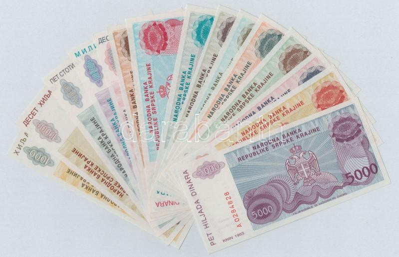 Horvátország / Krajna Szerb Köztársaság 1993. 5000D + 50.000D + 100.000D + 500.000D + 5.000.000D + 100.000.000D + 500.000.000D + 5.000.000.000D + 10.000.000.000D + 50.000.000.000D + 1994. 1000D + 10.000D + 500.000D + 1.000.000D + 10.000.000D T:I Croatia / Republic of Serbian Krajina 1993. 5000 Dinara + 50.000 Dinara + 100.000 Dinara + 500.000 Dinara + 5.000.000 Dinara + 100.000.000 Dinara + 500.000.000 Dinara + 5.000.000.000 Dinara + 10.000.000.000 Dinara + 50.000.000.000 Dinara + 1994. 1000 Dinara + 10.000 Dinara + 500.000 Dinara + 1.000.000 Dinara + 10.000.000 Dinara C:UNC Krause R20.a, R21.a, R22.a, R23.a, R24.a, R25.a, R26.a, R27.a, R28.a, R29.a, R30.a, R31.a, R32.a, R33.a, R34.a