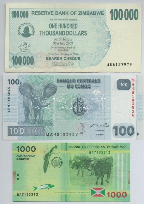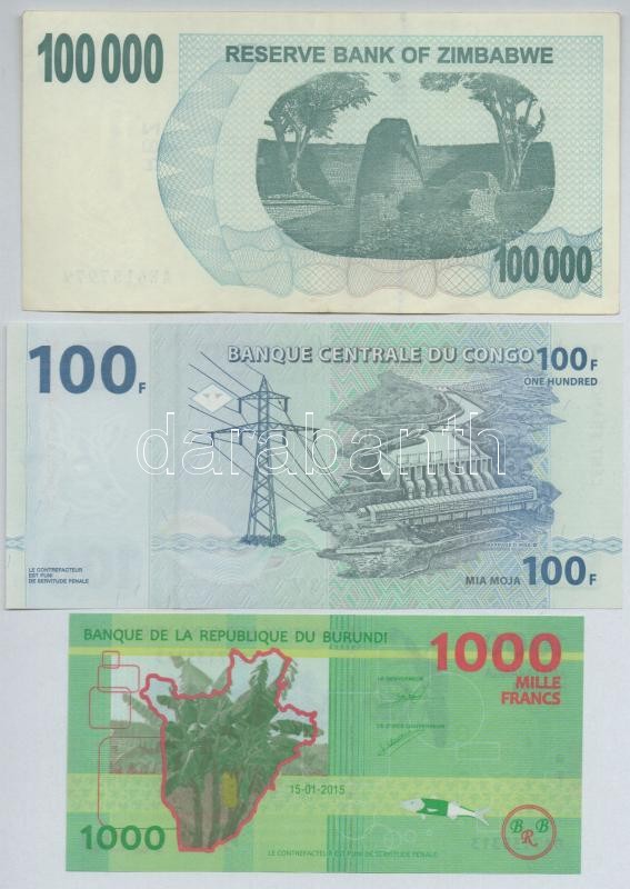 Vegyes: Burundi 2015. 1000Fr + Kongó 2007. 100Fr + Zimbabwe 2007. 100.000$ csekk T:I,I-,III