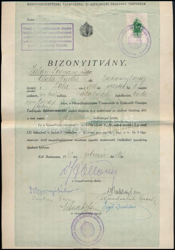 1942 Mozgóképüzemi üzemvezetői (működési) igazolvány, 2 db + bizonyítv...