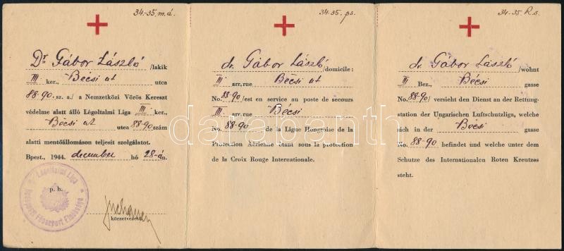1944 Bp., Légoltalmi Liga által kiadott többnyelvű igazolvány