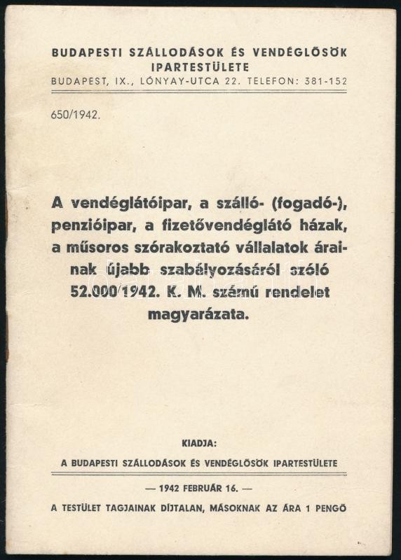 1942 A vendéglátóipar, a szálló, penzióipar [...] árainak újabb szabályozásáról szóló [...] rendelet magyarázata, 46p