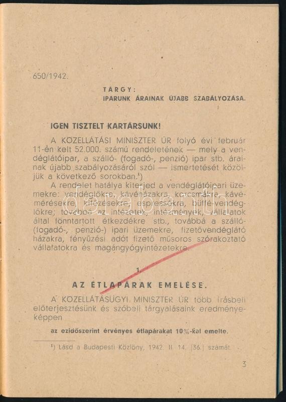 1942 A vendéglátóipar, a szálló, penzióipar [...] árainak újabb szabál...
