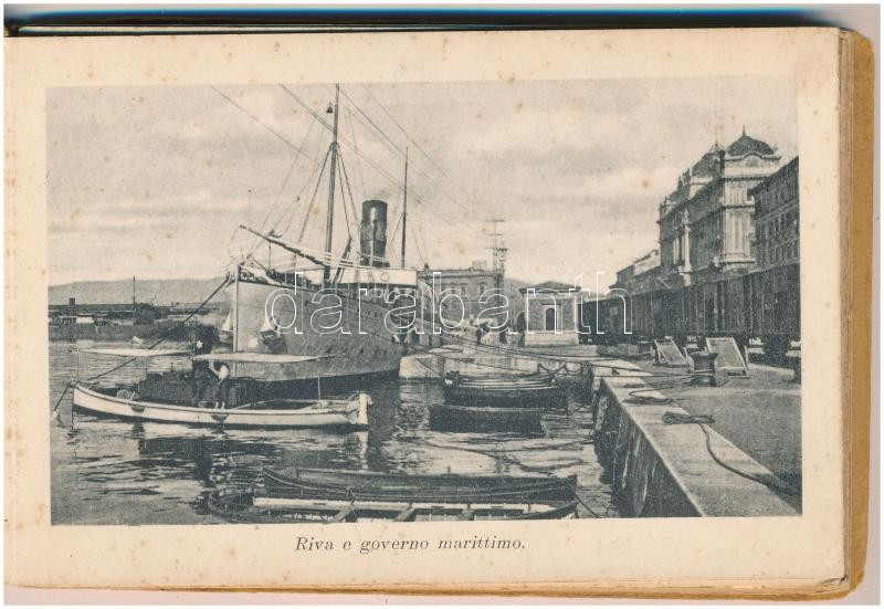 Fiume, leporellófüzet 20 lappal, Fiume és Abbazia. benne: Pannonia kivándorlási hajó, Adria kávéház, Stefanie szálloda, strand, fürdőzők, stb. / leporello booklet with 20 cards, inside: Piazza Adamich, Piazza Elisabetta, Café Adria, Pannonia Cunard Line emigration ship, steamship, Hotel Stefanie, beach, bathing people, etc.