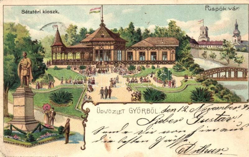 1899 Győr, Püspöki vár, Sétatéri kioszk, Kisfaludy szobor. Luszt Ármin kiadása. Art Nouveau, litho (EK)