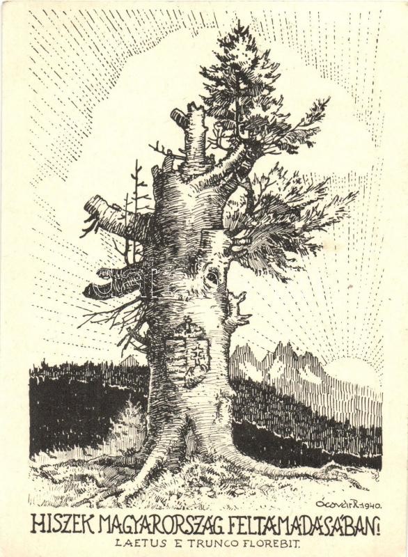 1941 Hiszek Magyarország feltámadásában! Ócsvár Rezső rajztanár és festőművész levele Megyer-Mayer Antal iparművésznek címezve / Laetus e Trunco Florebit / Hungarian irredenta art postcard s: Ócsvár Rezső (EK)