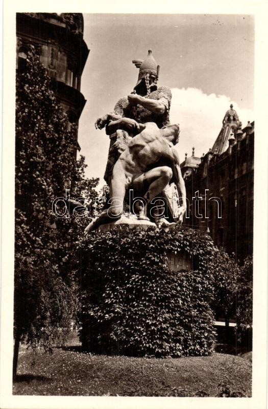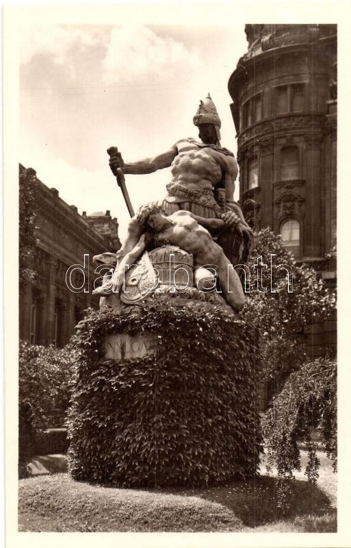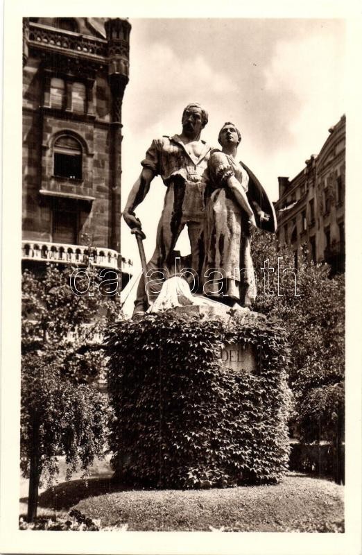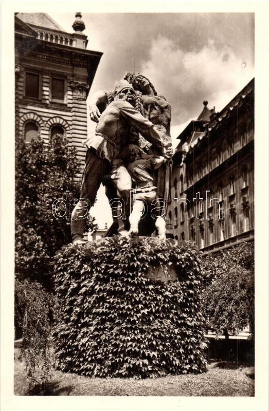 Budapest V. Szabadság tér, Trianon szoborcsoport, irredenta - 4 db régi lap Észak, Dél, Kelet, Nyugat szobraival; alkotók: Kisfaludi Strobl Zsigmond (É), Szentgyörgyi István (D), Pásztor János (K), Sidló Ferenc (Ny) / 4 pre-1945 postcards Hungarian irredenta statues