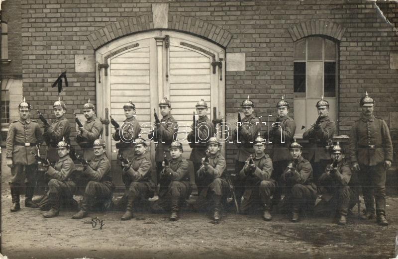Description: 1916 Német katonai csoportkép tüzelő állásban puskákkal / WWI Imperial German Army military group photo, soldiers in firing position with rifles. photo (EK)