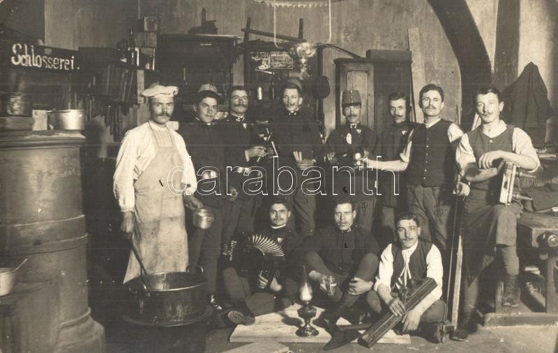 Description: Schlosserei, Tischler-Werkstatt. Első világháborús asztalos műhely, a megjelölt katonák nem ott dogloznak / WWI K.u.K. military, carpentry workshop interior, tagged soldiers are not working there.group photo (fl)