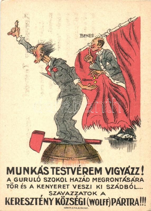 Description: Munkás testvérem vigyázz! A guruló Szokol hazád megrontására tör és a kenyeret veszi ki szádból... Szavazzatok a Keresztény Községi Pártra! Keresztény Községi (Wolff) Párt anti-kommunista és Benes ellenes propagandalapja. Klösz Gy. és fia / Hungarian elections campaign, Christian party's anti-communist and anti-Czechoslovakian propaganda card (EK)