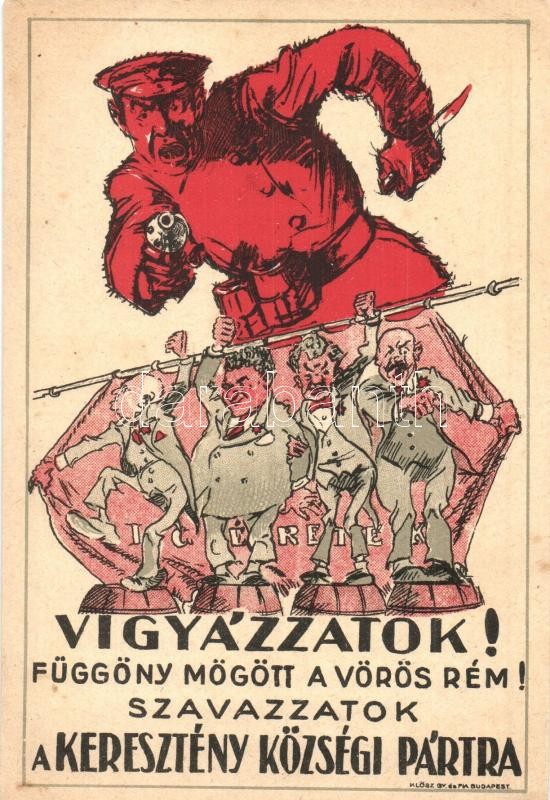 Description: Vigyázzatok! Függöny mögött a vörös rém! Szavazzatok a Keresztény Községi Pártra! Keresztény Községi (Wolff) Párt anti-kommunista és antiszemita propagandalapja. Klösz Gy. és fia / Hungarian elections campaign, Christian party's anti-communist and anti-semitic propaganda card (EK)