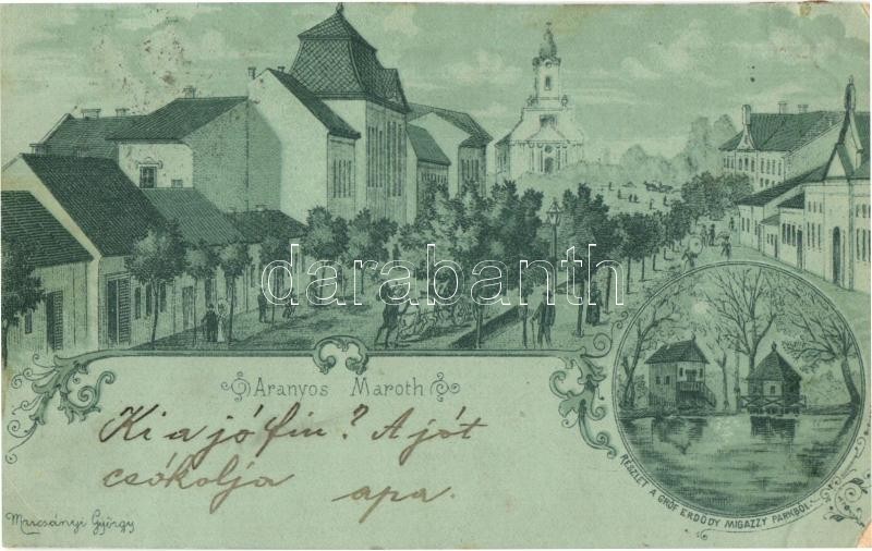 Description: 1898 Aranyosmarót, Zlaté Moravce; Fő utca, templom, Gróf Erdődy Migazzy kastély park / main street, church, castle park. Art Nouveau litho s: Marcsányi György (vágott / cut)