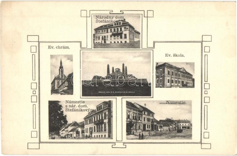 Berezó, Birkenhain, Brezová pod Bradlom; Národny dom Stefánikov, Ev. chrám, Ev. skola, Námestie, Námestie s nár. dom Stefánykovym, Mohyla Gen. M. R. Stefanika na Bradle. Nákladom St. Halabrin / Nemzeti ház, Evangélikus templom és iskola, Fő tér, üzlet, Milan Rastislav Stefánik tábornok, Csehszlovákia egyik megalapítójának sírhelye a Brádló-hegyen / national house, Lutheran church and school, monumental tomb of Milan Rastislav Štefánik on the Bradlo hill (fl)