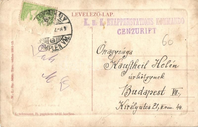 Description: Nagymihály, Michalovce; Kossuth Lajos utca, gyógyszertár, Aranybika szálloda és kávéház. W.L. Bp. 5636. / street, hotel and cafe, pharmacy + K.u.K. Etappenstations Kommando Cenzurirt (fa)