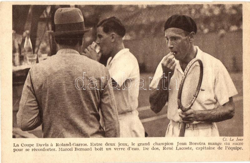 La Coupe Davis a Roland Garros. Entre deux jeux, le grand champion Jean Borotra mange du sucre pour se reconforter. Marcel Bernard boit un verre d'eau. De dos, René Lacoste, capitaine de l'équipe. / The Davis Cup at Roland Garros. Between games, the great champion Jean Borotra eats sugar to comfort himself. Marcel Bernard drinks a glass of water. From behind, René Lacoste, captain of the team. Tennis match, tennis players (vágott / cut)