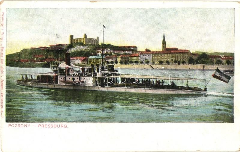 1907 Szamos monitor Pozsonynál, Dunai Flottilla. "Bediene dich allein / Szolgáld ki magad" kiadása / Donau-Flottille / Hungarian Danube Fleet river guard ship in Pressburg (Bratislava)