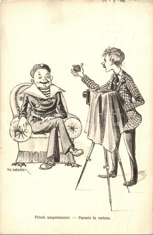 Frisch ausgemustert / Passato la recluta / K.u.k. Kriegsmarine art postcard, mariner with photographer. G. Fano Pola 1910-11. s: Ed. Dworak