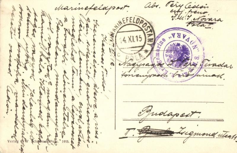 SMS Novara Osztrák-Magyar Haditengerészet Helgoland-osztályú gyorscirkálója / Austro-Hungarian Navy K.u.K. Kriegsmarine Helgoland-class light cruiser + Marinefeldpostamt + SMS Novara Kriegsmarine stamp on the backside