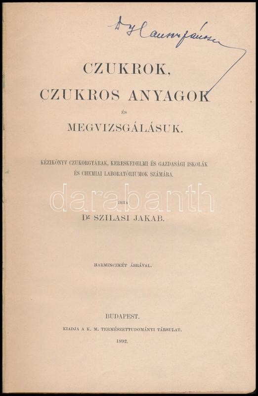 Dr. Szilasi Jakab: Czukrok, czukros anyagok és megvizsgálásuk. Kézikönyv czukorgyárak, kereskedelmi és gazdasági iskolák és chemiai laboratóriumok számára. Bp.,1892, K. M. Természettudományi Társulat, VIII+180 p. Korabeli félvászon-kötés, Gyulafehérvár, Kovács B. Albert könyvkötészete, kissé kopott borítóval. Dr. Hauser János (1891-1964) mezőgazdasági mérnök, főiskolai tanár névbejegyzésével.