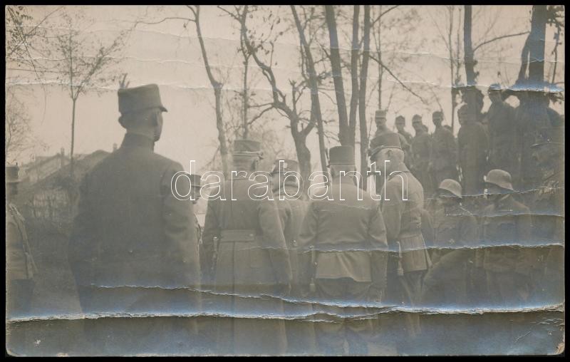 cca 1917 IV, Károly a fronton magyar csapatokat vizitál főtisztekkel. Hajtásnyommal. / WW: I. Military photo with Karl Emperor. Folded. 9x15 cm