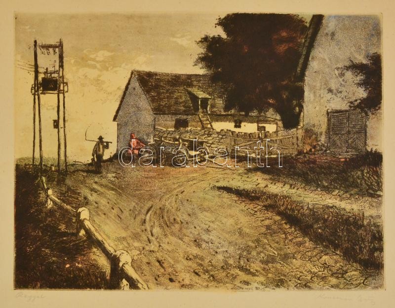 Konecsni György (1908-1970): Reggel. Színezett rézkarc, karton, jelzett, 30×39 cm