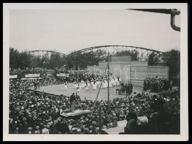 1934 Tokaj, magyar tánc, irredenta színpad háttérrel (Nagy-Magyarorszá...