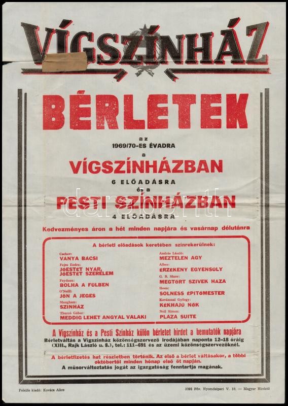 1969 Vígszínház 1969/70-es évad plakát, ragasztott szakadással, 41,5x3...