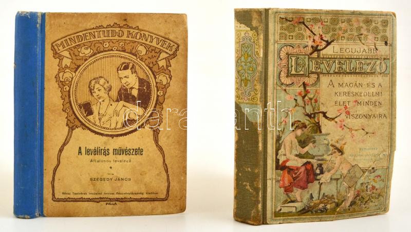 Vegyes könyvtétel, 2 db: Brankovics György: A legújabb magyar általános levelező. Bp, é.n.,Franklin-Társulat, 415 p. Harmadik kiadás. Kiadói illusztrált félvászon-kötés, kopott, foltos borítóval, az elülső borító sérült. Szegedy János: A levélírás művészete. Általános levelező. Bp.,é.n.,Révai. Kiadói illusztrált félvászon-kötés, kopott, foltos borítókkal, foltos lapokkal.