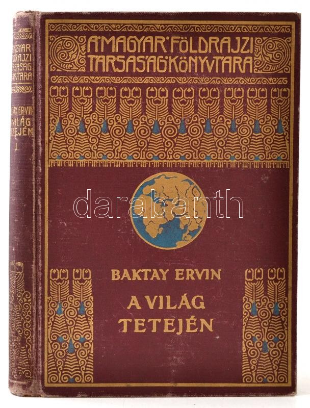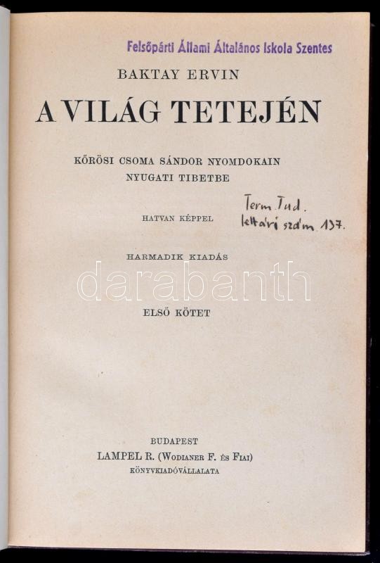 Description: Baktay Ervin: A világ tetején I. kötet. Kőrösi Csoma Sándor nyomdokain Nyugati Tibetbe. Magyar Földrajzi Társaság Könyvtára. Bp., é. n., Lampel R. (Wodianer F. és Fiai.) Rt. Kiadói dúsan aranyozott egészvászon sorozatkötésben, kopott borítóval, intézményi bélyegzővel.