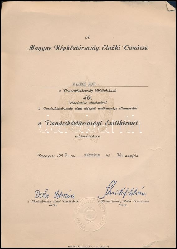 https://www.darabanth.com/en/332-Online-auction/332.0/Other-collectibles/Autographs~500020/1959-Dobi-Istvan-allamfo-alairasa-emleklapon~II1853108