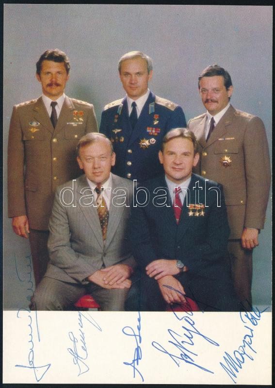 Farkas Bertalan (1949-), Magyari Béla (1949-2018), Valerij Kubaszov (1935-2014) és két további űrhajós aláírása levelezőlapon