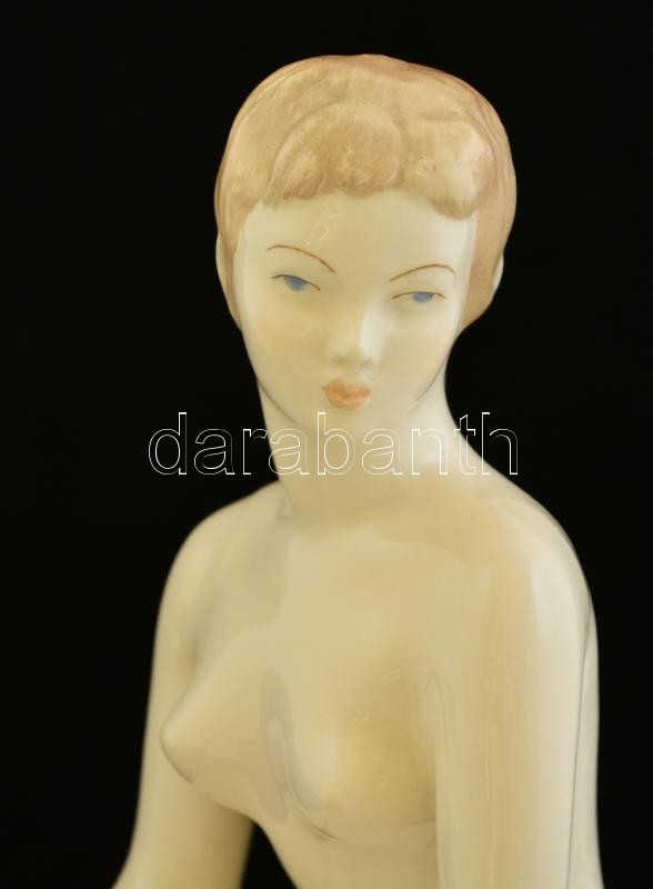 Aquincumi porcelán térdelő akt, kézzel festett, jelzett, apró kopásokkal, m: 22,5 cm