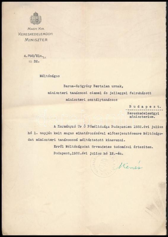 Description: 1932 Barna-Szörény Bertalan miniszteri tanácsosi kinevezése, Kenéz Béla (1871-1946) kereskedelemügyi miniszter aláírásával, a m. kir. kereskedelmügyi miniszer fejléces papírján, szárazbélyegzővel.