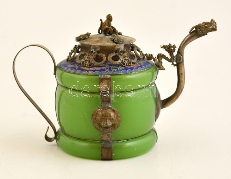 Dekoratív keleti jade-fém kiöntő, apró kopásokkal, m: 10 cm