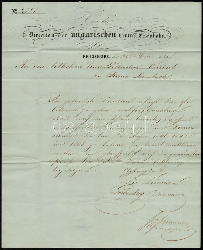 1845 A Magyar Középponti Vasút társaság levele a rimaszombati vasgyár ... https://www.darabanth.com/en/332-Online-auction/332.0/Other-collectibles/Historical-documents-manuscripts~500019/1845-A-Magyar-Kozepponti-Vasut-tarsasag-levele-a-rimaszombati-vasgyar-tarsasagnak-a-kovetke~II1859690