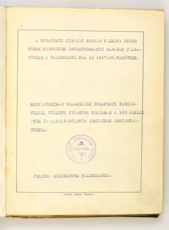 1938 Balneológiai és gyógyszerészeti kísérlet teljes dokumentációja. E... https://www.darabanth.com/en/332-Online-auction/332.0/Other-collectibles/Historical-documents-manuscripts~500019/1938-Balneologiai-es-gyogyszereszeti-kiserlet-teljes-dokumentacioja-Egyetemi-csoport-ossze~II1857038