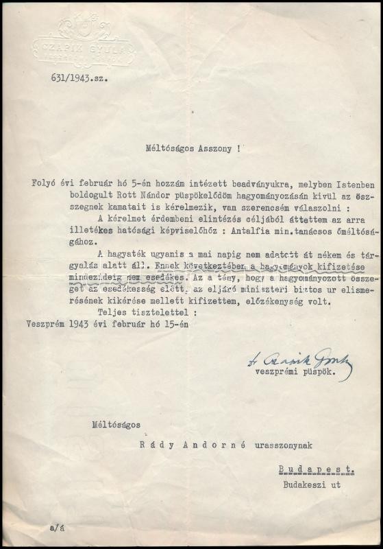 https://www.darabanth.com/en/332-Online-auction/332.0/Other-collectibles/Historical-documents-manuscripts~500019/1943-Dr-Czapik-Gyula-1887-1956-veszpremi-puspok-gepelt-levele-a-vegen-sajat-kezu-alairC3~II1858328