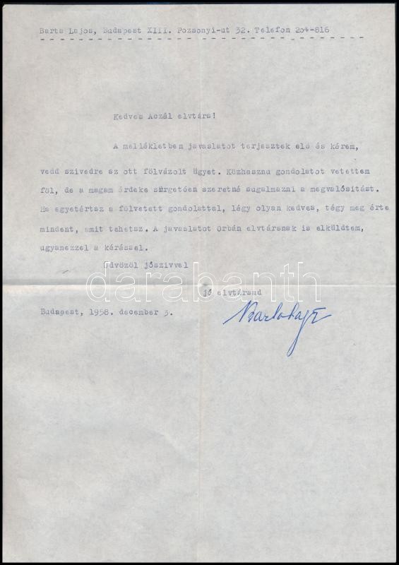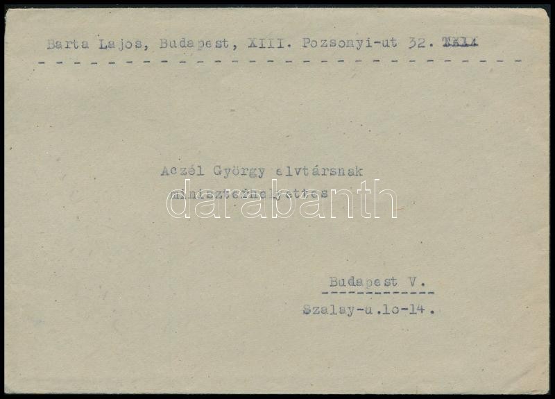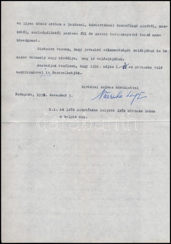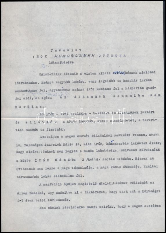 1958 Barta Lajos (1878-1964) író saját kézzel aláírt két levele Aczél Györgynek, melyben írók otthonának létrehozására tesz javaslatot.
