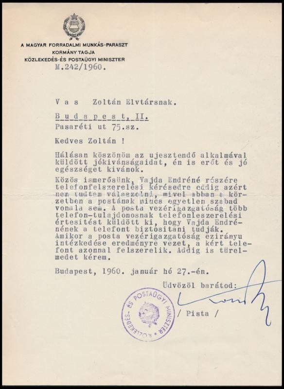 1960 Kossa István közlekedésügyi- és postaügyi miniszter személyes han... https://www.darabanth.com/en/332-Online-auction/332.0/Other-collectibles/Historical-documents-manuscripts~500019/1960-Kossa-Istvan-kozlekedesugyi-es-postaugyi-miniszter-szemelyes-hangu-levele-autograf-a~II1851850