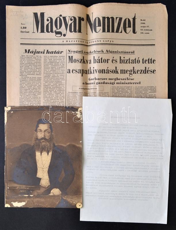 Angyal Antal (1812?-1877) 1849-ben halálra ítélt gyógyszerész portréjáról készült reprodukció, kapcsolódó gépelt levéllel és újságcikkel